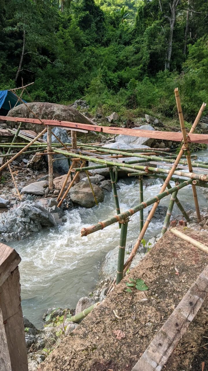 “Sekarang kami kekurangan bahan”, ujar Imanuel Ore, salah satu masyarakat yang ikut bergotong royong membangun jembatan darurat ini.