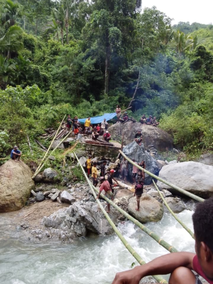 “Sekarang kami kekurangan bahan”, ujar Imanuel Ore, salah satu masyarakat yang ikut bergotong royong membangun jembatan darurat ini.