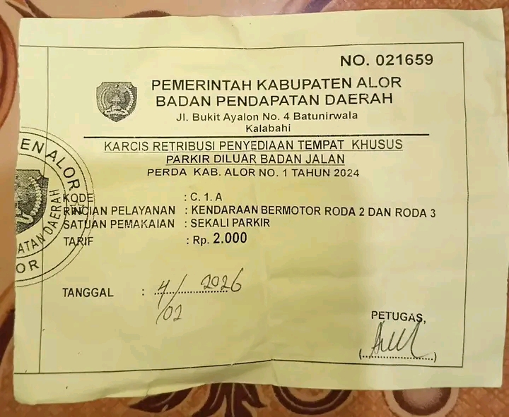 Untuk diketahui, karcis retribusi parkir penyediaan tempat khusus parkir diluar badan jalan ini dikeluarkan oleh Pemerintah Kabupaten Alor melalui Badan Pendapatan Daerah sesuai Perda Kabupaten Alor No. 1 tahun 2024 yang diperuntukkan kendaraan roda dua maupun roda tiga dengan sekali parkir dikenakan biaya sebesar Rp. 2.000.