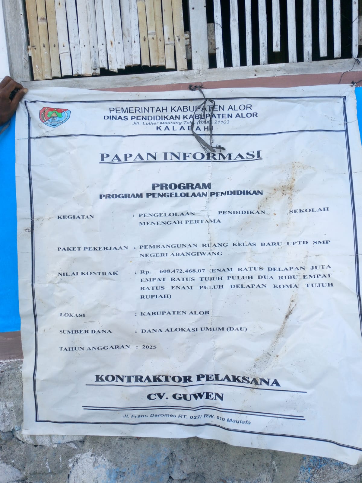 Sekretaris Komite SMP Negeri Abangiwang Solfius Klaping yang berhasil ditemui Wartawan Warta Nusa Kenari mengatakan, pekerjaan ini diawali sejak 8 Oktober 2025 dengan perusahaan pelaksana CV Guwen dan kontraktor Ori Blersir.